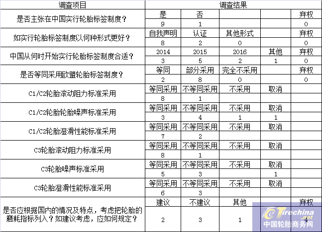 在中國實(shí)施輪胎標(biāo)簽制度的調(diào)查顯示,10家中國代表企業(yè)均傾向于實(shí)施輪胎標(biāo)簽制度。