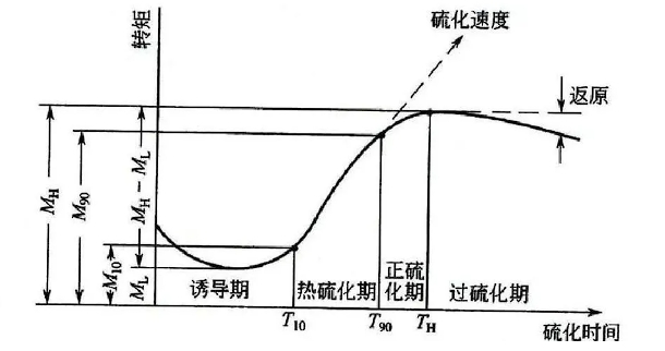 - 正硫化時間:正硫化時間可以通過硫化儀測試橡膠的硫化曲線得到。硫化曲線中通常包括焦燒時間(T10,指橡膠開始硫化的時間)、正硫化時間(T90,指橡膠性能達到最佳的硫化時間)等。