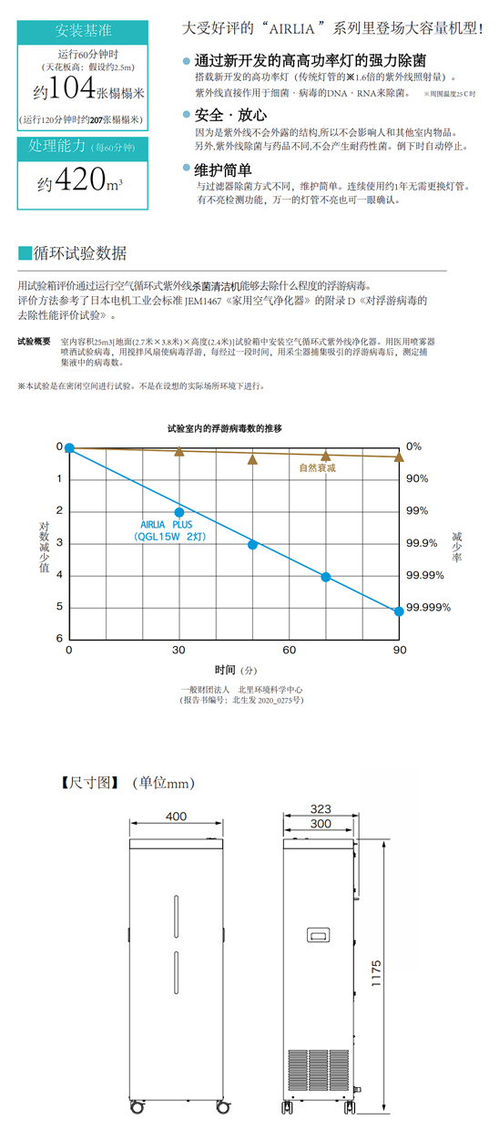 AIRLIA PLUS型號(hào)是對應(yīng)約420m³大空間的大容量類型,在用高功率的紫外線燈增加除菌力的同時(shí),保持靜音性的大容量機(jī)型。