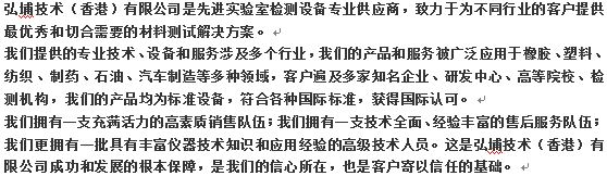弘埔技術(shù)(香港)有限公司是先進(jìn)實(shí)驗(yàn)室檢測(cè)設(shè)備的專業(yè)供應(yīng)商,致力于為不同行業(yè)的客戶提供切合需要的材料測(cè)試解決方案,我們所提供的專業(yè)設(shè)備、技術(shù)和服務(wù)涉及多個(gè)行業(yè),我們的產(chǎn)品和服務(wù)被廣泛應(yīng)用于橡膠、塑料、紡織、石油、汽車制造等多種領(lǐng)域?蛻舯榧岸嗉抑髽I(yè)、研發(fā)中心、高等院校、檢測(cè)機(jī)構(gòu),我們的產(chǎn)品均為試驗(yàn)設(shè)備,符合相關(guān)國(guó)際標(biāo)準(zhǔn)。